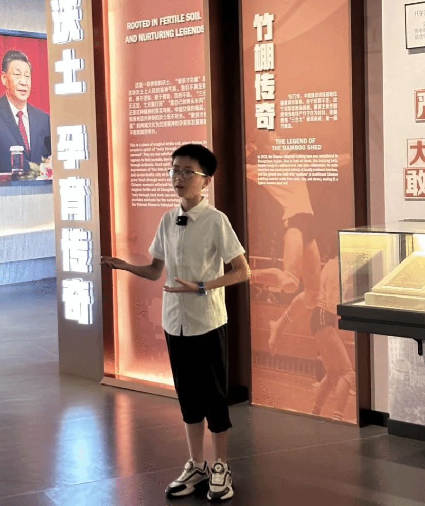 习近平总书记强调:“体育强则中国强,国运兴则体育兴”,排球作为一项体育运动,是增强人民体质,促进身心健康发展的重要方式,而中国女排更是我们家喻户晓的一支队伍。女排精神展示馆“冠军摇篮展厅”前,实践团成员汪相汝牵着惠民社区丞汐、丞渊兄妹的手,将中国女排的故事娓娓道来,通过生动语言讲述着女排队员们“祖国至上、团结协作、顽强拼搏、永不言败”的精神面貌,在场的社区少年们不仅从感悟女排精神过程中深刻感受到中华人民共和国成立75周年来取得的伟大成就,更在心中种下了女排精神的种子。