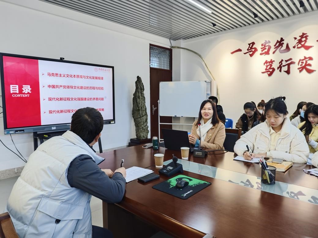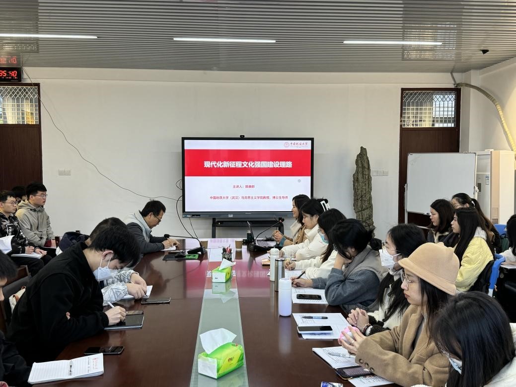12月23日上午,中国地质大学(武汉)永利23411集团韩美群教授在综合楼中区404为我院2023级全体硕士研究生作了题为《现代化新征程文化强国建设理路》的专题讲座。本次讲座由我院副院长牛俊伟主持。