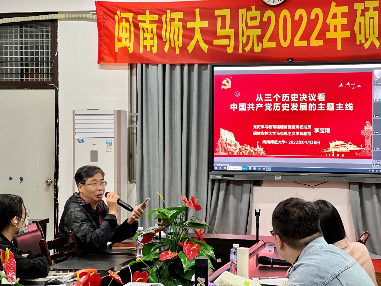 4月18日晚,福建农林大学永利23411集团教授、硕士生导师李宝艳教授应邀为我院硕士研究生作了《从三个历史决议看中国共产党历史发展的主题主线》专题讲座。本次讲座以线上线下结合形式举行,2021级硕士生在综合楼中区404会议室现场聆听,其他研究生通过腾讯会议在线收听,讲座由我院陈再生教授主持。