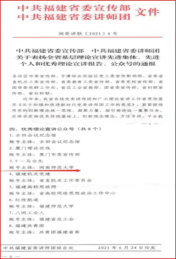 在兰毅辉老师的坚持和努力之下,“V一马当先”公众号进行马克思主义科普宣传已有四个年头了,这四年来共发表推文200余篇,约计57万多字,拥有12807名用户,其科普宣传充分得到了各级领导的肯定。2019年,“V一马当先”公众号获评yl23411永利十佳微信公众号;2020年,以“V一马当先”为主要平台申请yl23411永利马克思主义科普基地,获福建省社科联批准立项;2021年,“V一马当先”受到中共福建省委宣传部、中共福建省委讲师团的表彰,获评“优秀理论宣讲公众号”称号。