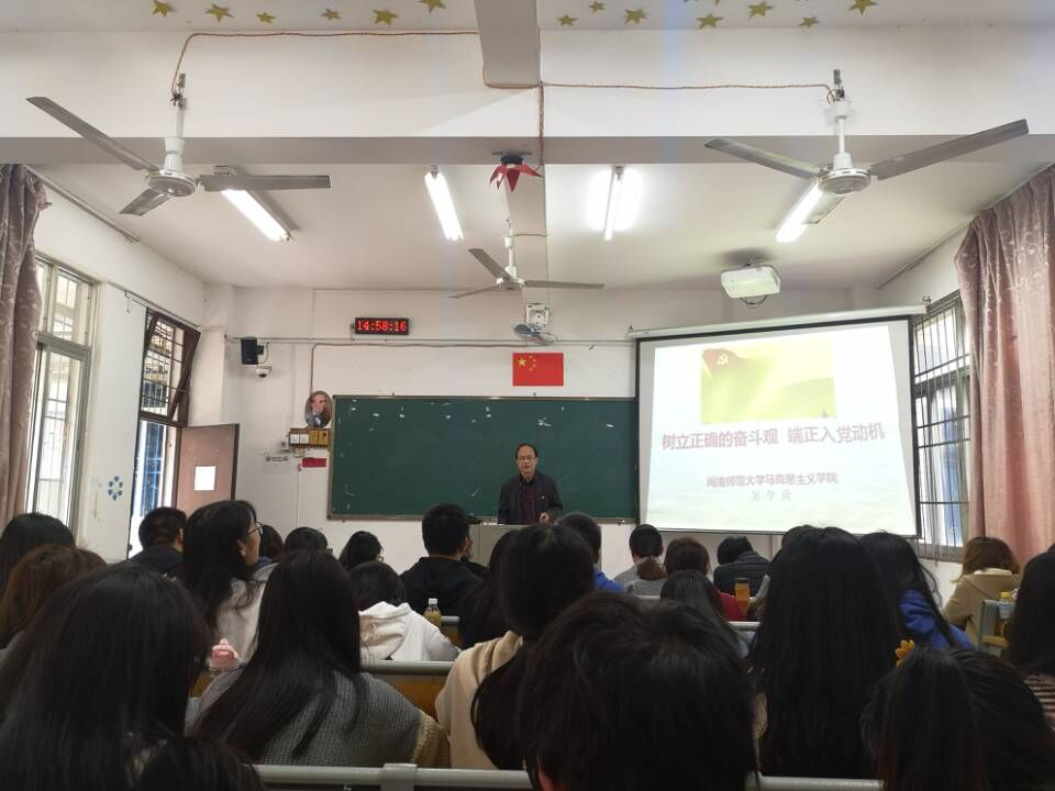 3月21日上午,刘立振老师于综南202开讲了本次培训的第五次课程。就《树立正确的奋斗观,端正入党动机》的主题,刘立振老师点明,伟大事业都始于梦想,梦想激发活力的源泉,要在奋斗中端正入党动机,并且深入学习习近平“奋斗幸福观”的深刻内涵。