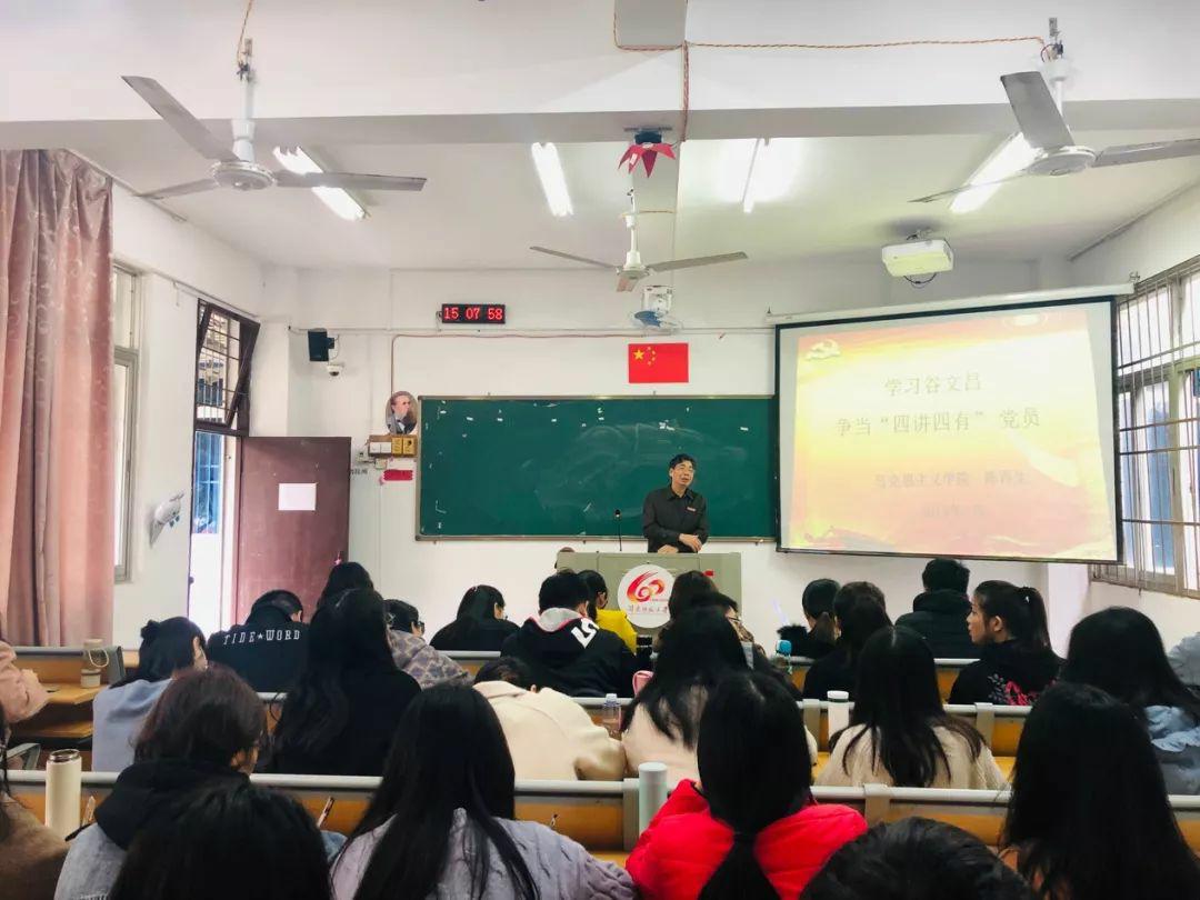 3月10日下午,陈再生院长在综南201开讲了本次党校培训的第二次课。本节课的主题是《弘扬谷文昌精神,争做“四讲四有”合格党员》。主要包括三方面的内容: 何为四有党员、谷文昌是“四讲四有”党员的标杆、如何成为“四讲四有”党员。