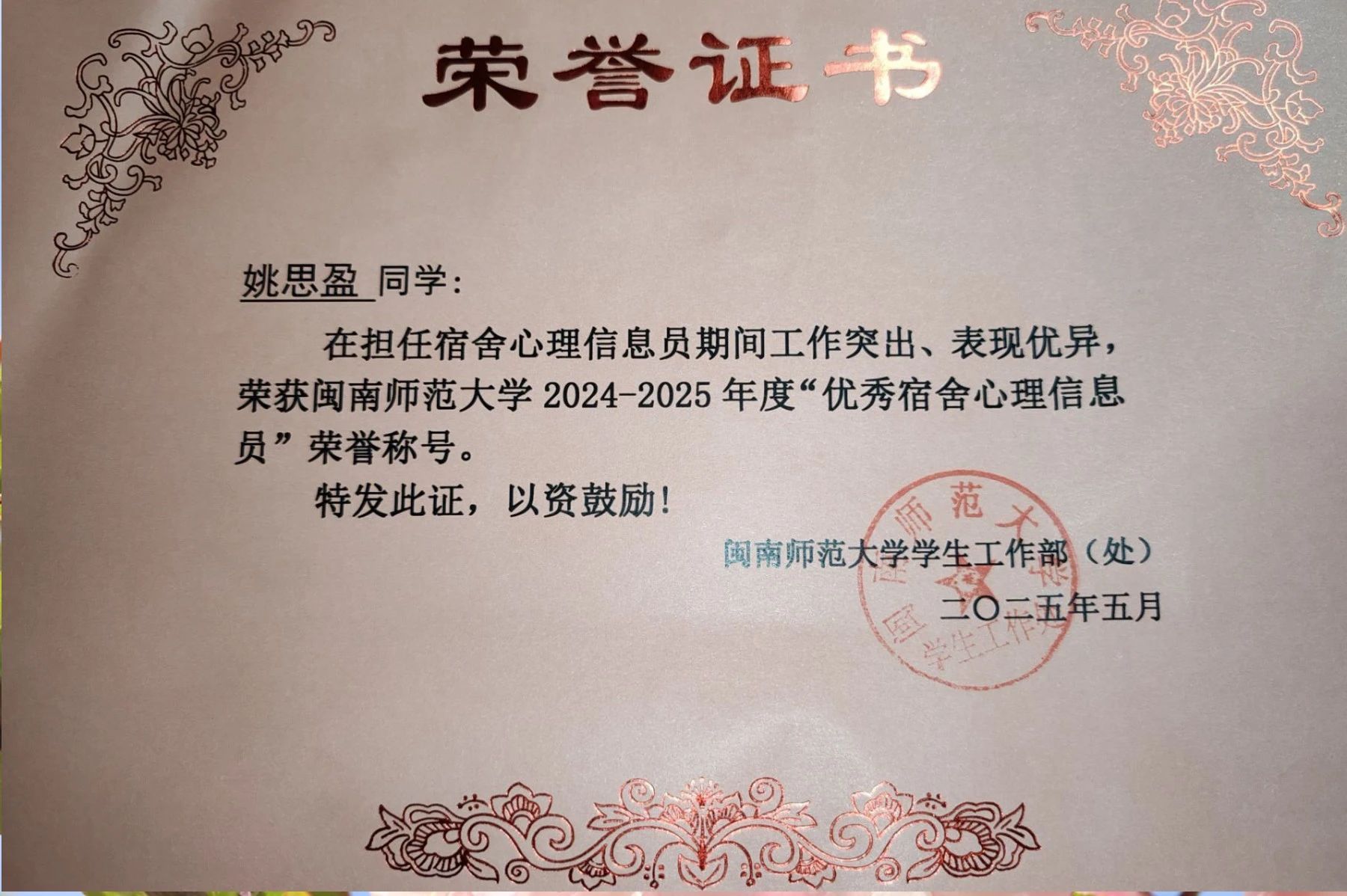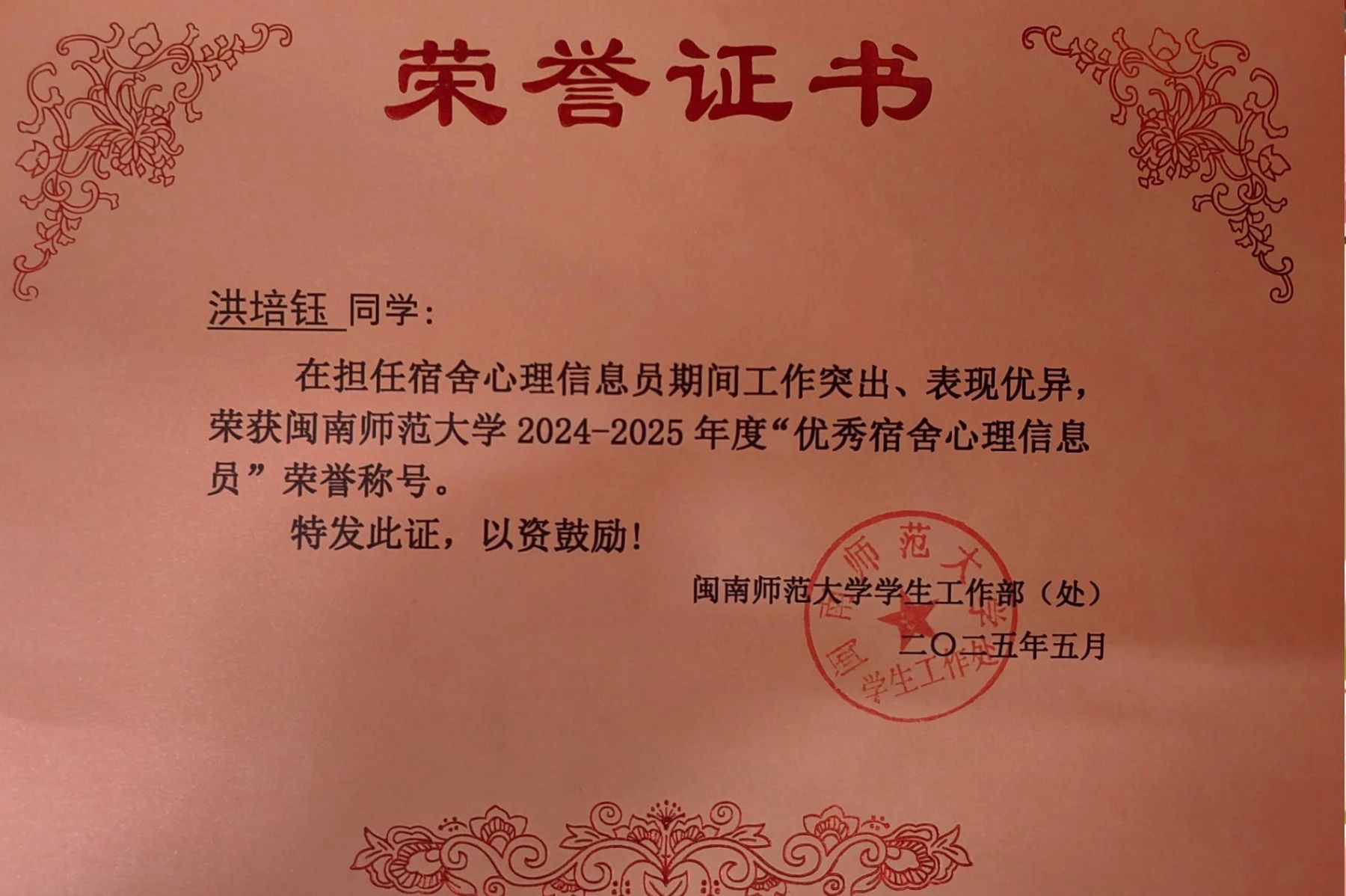 我院心理辅导站获2023-2025年度优秀心理辅导站荣誉称号,2021级思政1班李雨婷同学荣获优秀班级心理委员,2022级思政2班洪培钰和2023级思政2班魏熠欣、姚思盈、庞量午4位同学荣获优秀宿舍心理委员。