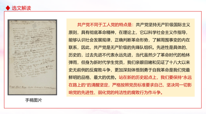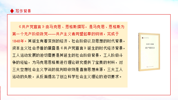 分享语:置身伟大时代,追寻思想源头。马克思主义的诞生是人类思想史上“一次最壮丽的日出”,重温《共产党宣言》这部经典著作,越发强烈地感受到真理璀璨夺目的光芒,照亮前行的道路,给人以奋进的无穷力量。