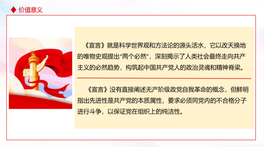 《共产党宣言》深刻揭示了人类社会最终走向共产主义的必然趋势,构筑起中国共产党人的政治灵魂和精神脊梁。也鲜明指出先进性是共产党的本质属性,为了保证党在组织上的纯洁性,就必须同党内的不合格分子进行斗争。