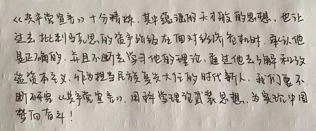 通过此次关于《共产党宣言》的读书会,帮助同学们更好地理解马克思主义的丰富内涵和精髓要义。同时也激励了大家进一步掌握和运用马克思主义的立场观点方法,不断从中汲取智慧和力量。用理想之光照亮奋斗之路,用实践伟力开创美好明天!