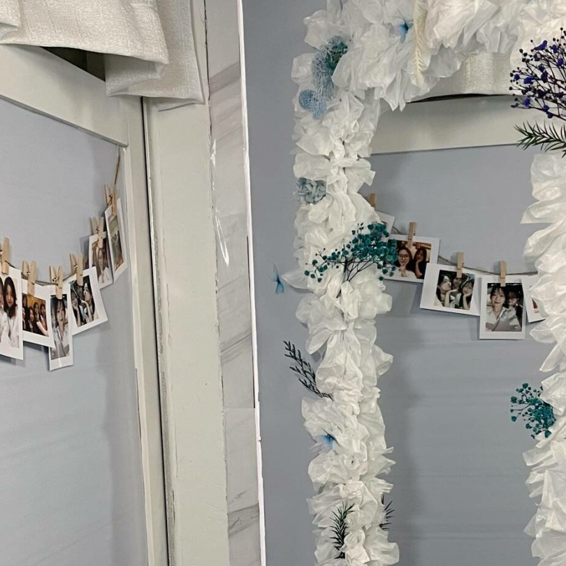 D北326宿舍以蓝白为主基调,秉持“绿水青山就是金山银山”的绿色发展理念,旨在营造一个宁静、清新、自然的宿舍环境。“落叶风铃”、雪梨纸干花装饰的镜子、“生态文明”文化墙、利用废弃的口罩制作的生机勃勃的口罩之花,都是宿舍成员利用环保材料手工制作的小巧思。总之,D北326把绿色环保融入宿舍,融入宿舍成员们的生活,让绿色发展理念“铭于心、践于行”。
