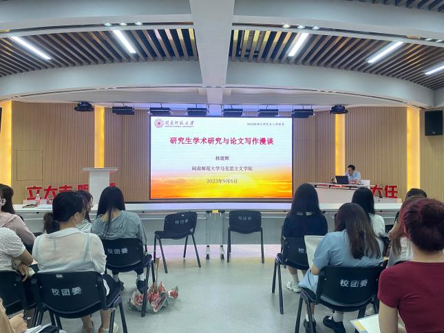 9月6日上午,我院在达理活动中心3楼召开了以研究生学术研究及论文写作为主题的2023级研究生新生入学教育。会议邀请永利23411集团林建辉教授作为主讲嘉宾,院团委副书记潘怀杰老师主持本次会议。