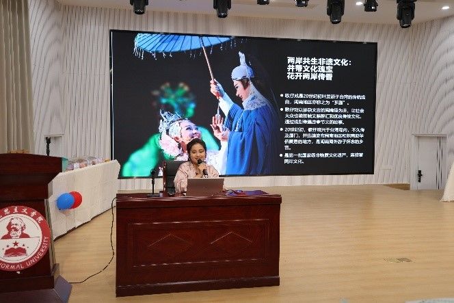 芗剧,也可以称为歌仔戏,在2005年被列入福建省首批非物质文化遗产名录,2006年被列入首批国家级非物质文化遗产名录,是我国近400种戏曲剧种中唯一同根共生、花开两岸的地方戏曲,是两岸同胞同根同源的见证。李姿莹老师首先为在座的同学们讲述了台湾歌仔戏发展的历史,使同学们认识到这不仅是一部地方戏曲艺术的演变史,更是一段两岸文化交流的历史。随后,李姿莹老师与连思颖同学通过师生同台表演、现场体验等方式,使同学们近距离感受到了芗剧独特的身段韵律、细腻的表演手法以及优美的唱腔唱段,点燃了在座同学对芗剧乃至中华优秀传统文化的热情。