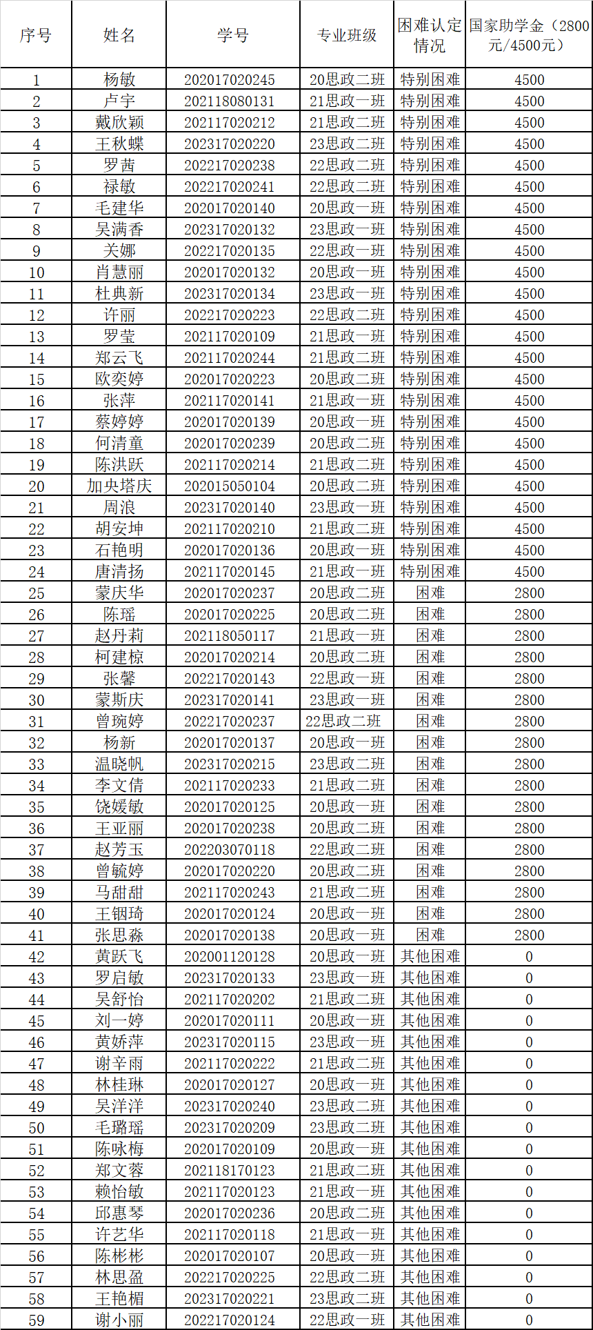 2023-2024学年国家助学金评定名单学院公示期为2023年11月6日—2023年11月10日(5个工作日),以上结果如有异议,请在公示期内与学生工作领导小组联系。