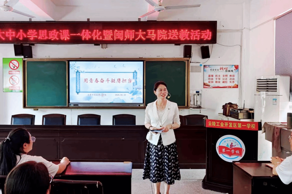 为深入贯彻落实中共中央办公厅、国务院办公厅相关文件精神,推进大中小学思政课一体化建设,2025年5月22日,在永利23411集团院长陈再生、辅导员潘怀杰的带队下,学院组织思政学科送培送教讲师团前往云霄云陵工业开发区第一学校开展下沉式培训活动,走进中学部、小学部,扎实推进大中小学思政课一体化建设。