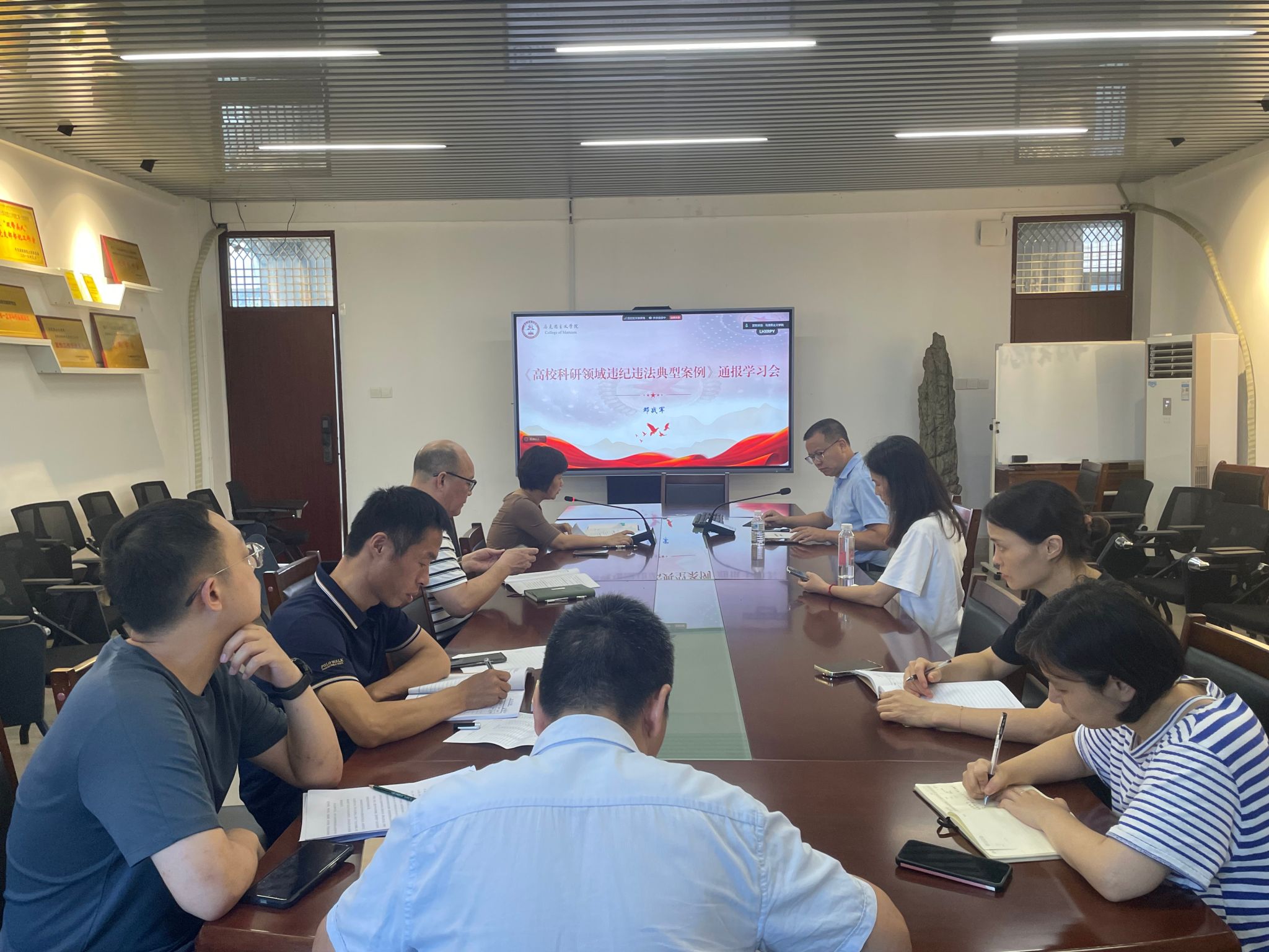会上,院纪委书记、分管科研工作副院长组织大家一起学习了高校科研领域六大类型违纪违法典型案例,重点通报了国内其他高校:在科学技术活动的申报、评审、实施、验收、监督检查和评估评价等活动中提供虚假材料,实施“打招呼”“走关系”等请托行为的违纪违法案例;故意夸大研究基础、学术价值或科技成果的技术价值、社会经济效益,隐瞒技术风险,重复申请等造成负面影响或财政资金损失等行为的违纪违法案例;人才计划入选者、重大科研项目负责人在聘期内或项目执行期内擅自变更工作单位,造成负面影响或财政资金损失等行为的违纪违法案例;抄袭、剽窃、侵占、篡改他人科学技术成果,编造科学技术成果,侵犯他人知识产权等行为的违纪违法案例;虚报、冒领、挪用、套取财政科研资金等行为的违纪违法案例;开展危害国家安全、损害社会公共利益、危害人体健康的科学技术活动等行为的违纪违法案例。