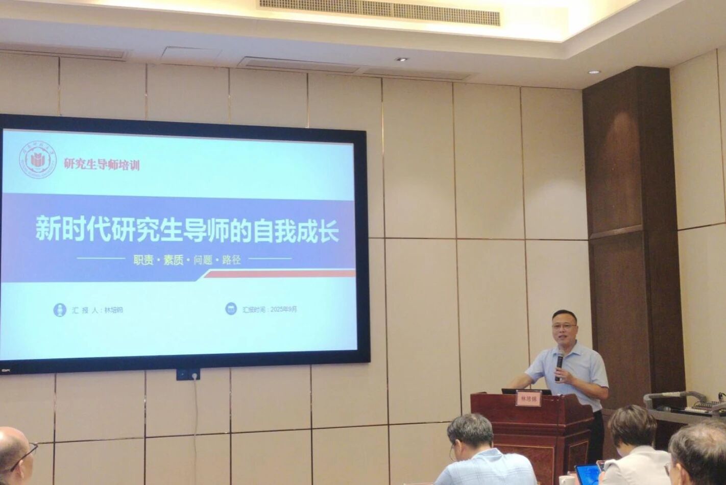 校研究生工作处副处长林培锦教授作主题为《新时代研究生导师的自我成长》的专题报告。林教授逐一分析研究生导师的“八大”职责”及基本职责的六维模型,解析研究生导师“五位一体”素养模型,同时立足研究生导师成长中的三大问题讲述研究生导师自我成长“路径选择”,从角色定位、能力跃升、德行修炼着手不断提升研究生导师的能力素养。