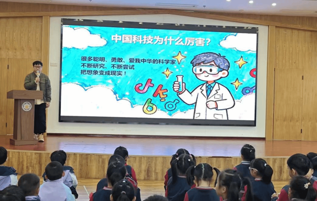 活动伊始,思政小课堂开启。马怡老师以“红心耀全运”为主题,借助色彩鲜明的图片、赛场精彩的视频讲述全运会赛场上的运动故事,从短跑运动员冲刺的矫健身姿,到体操选手舒展的优美动作,一个个鲜活场景让孩子们目不转睛,孩子们在直观感受运动魅力的同时,悄然感知国家强大的体育实力;随后,姚禹老师带来“新时代的伟大科技成就”主题分享,屏幕上遨游太空的卫星、飞驰的高铁等图片瞬间吸引了孩子们的注意力,他将抽象的科技知识转化为幼儿能理解的生动内容,孩子们踊跃回答、积极互动,现场的氛围欢快热烈。