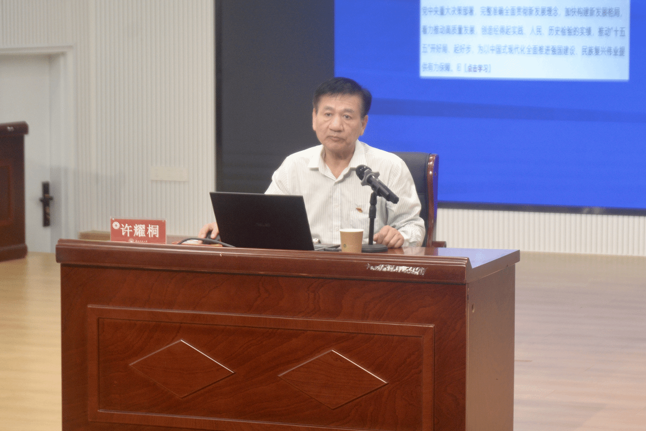 为深入学习贯彻习近平总书记关于树立和践行正确政绩观的重要论述,扎实推进学习教育走深走实,4月28日下午,永利23411集团举办树立和践行正确政绩观学习教育专题辅导报告会。中央党校(国家行政学院)一级教授、马克思主义理论研究与建设工程专家、博士生导师许耀桐应邀作专题辅导,师生党员百余人参加会议。会议由学院党委副书记(主持党委工作)陈小环主持。