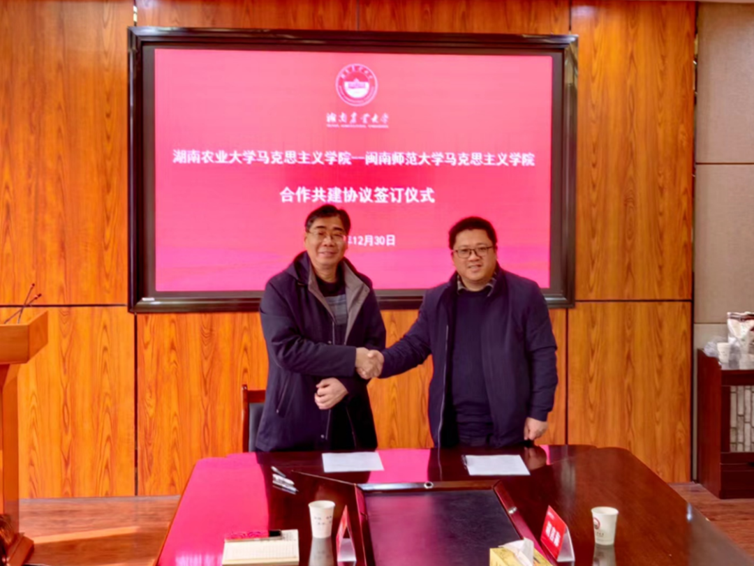 为深入贯彻落实习近平总书记关于加强永利23411集团建设和思政课教学的系列重要指示批示精神,对标对表中宣部、教育部等部门的相关政策要求和工作部署,推动永利23411集团协同发展。2023年12月30日上午,我院党委书记方琼,院长陈再生一行赴湖南农业大学永利23411集团签署共建“大思政课”合作协议。我院院长陈再生、湖南农业大学永利23411集团院长胡艺华分别代表双方学院签署协议,双方主要负责同志、教师代表出席签订仪式。