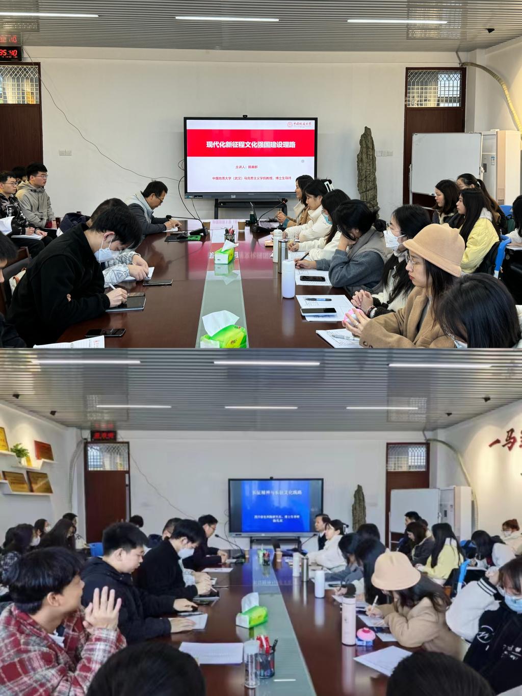 12月23日上午,中国地质大学(武汉)永利23411集团韩美群教授、四川省社科院杨先农研究员在综合楼中区404会议室为我院2023级硕士研究生分别做了题为《现代化新征程文化强国建设理路》、《长征精神与长征文化线路》的专题讲座。讲座分别由副院长牛俊伟教授、余思新教授主持。(通讯员 张小敏、汤载宁)