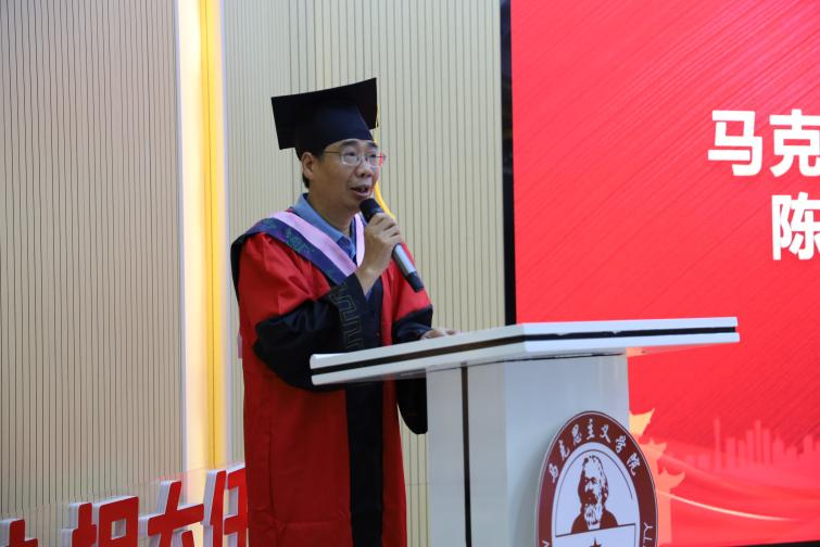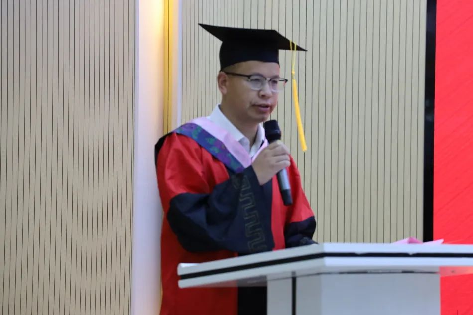 随后,陈再生院长致辞。他指出,这几年正是学院大发展、大提高的时期。在马院师生的共同努力下,学院取得了一系列成绩,驶入了发展的快车道,见证了学院成立十周年,学院并以此为起点接续奋斗。全体马院人爱岗敬业、奋发有为,战斗在教书育人的一线,承担着科学研究、社会服务的重任,为福建省重点建设高校、福建省“双一流”建设高校及和谐校园做出了应有贡献。在今年毕业的同学中,有5名研究生成功考博,28名本科生成功考取硕士研究生。这不仅是属于马院的荣誉,更是大家拼搏进取的印记。临别之际,他对同学们提出几点嘱托:一是希望大家目有山川,做一个成长路上志存高远的人;二是希望大家心有明灯,做一个拼搏路上善良温暖的人;三是希望大家胸有丘壑,做一个圆梦路上懂得坚持的人。