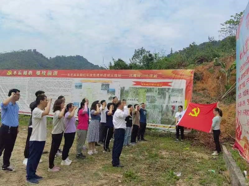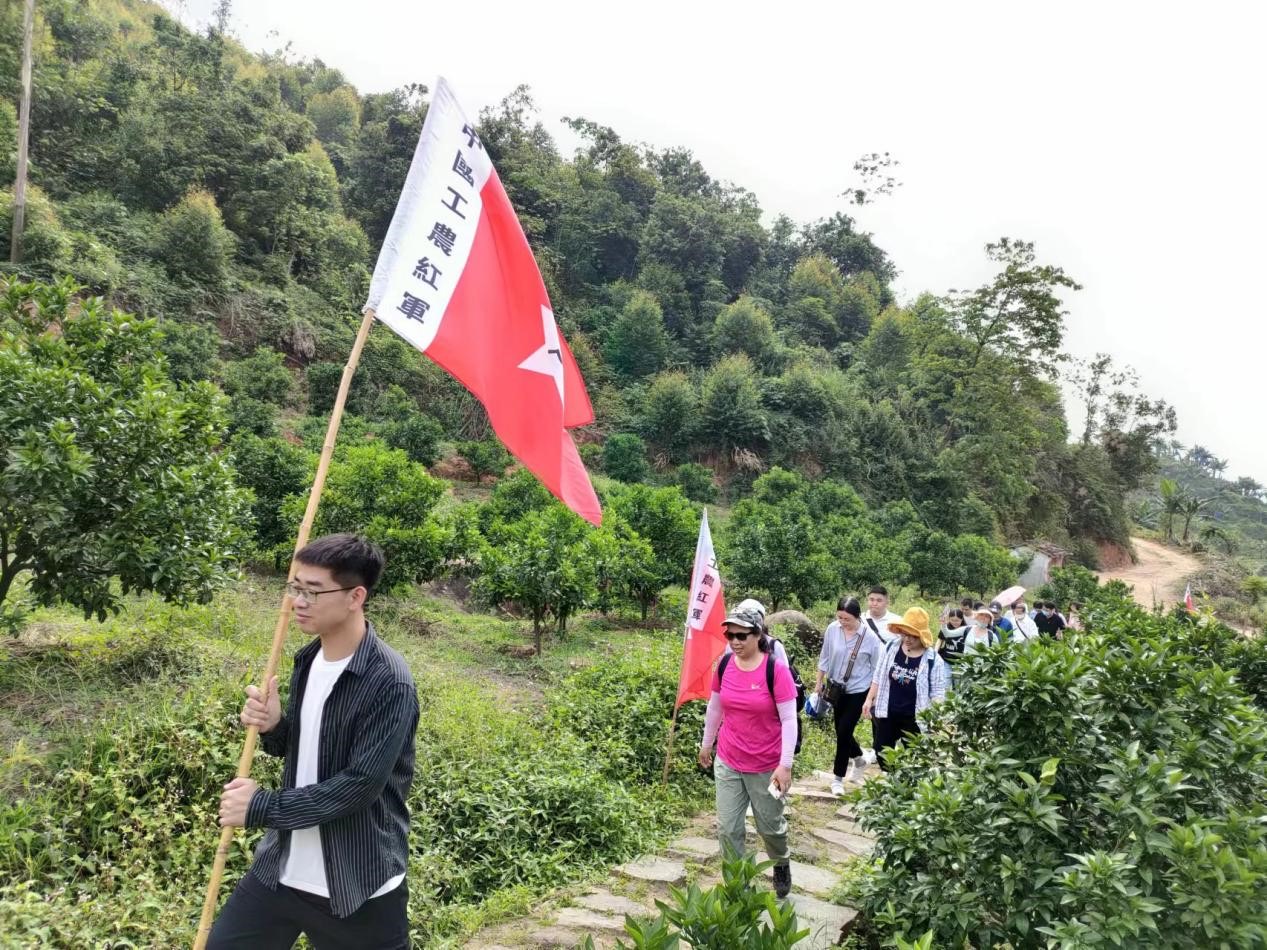活动伊始,全体党员同志扛红军旗,重走1932年毛主席率领红军攻克漳州行军路线,沿红军路行军到风霜岭山顶,听漳州战役讲解,看红军树、作战指挥所、古战壕、古驿站旧址、唐宋元明清时期的国道、观景台通览漳州战役主战场全貌;之后全体党员在学院党委书记李定庆同志带领下在古战场重温入党誓词。