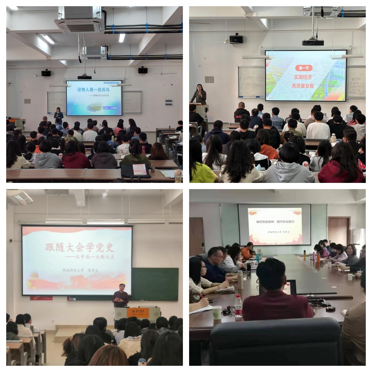 3月11日上午,陈再生教授走进莆田学院本科生思政课课堂,主讲了《跟随大会学党史——从中共一大到七大》。林志芳副教授、许晓玲教授为湄洲湾职业技术学院学生分别做了《实现经济高质量发展》《没有人是一座孤岛——正确认识人的本质》的“毛泽东思想和中国特色社会主义理论体系概论”和“思想道德与法治”课的教学示范课。示范课教学设计巧妙,教学内容丰富,教学现场互动热烈。