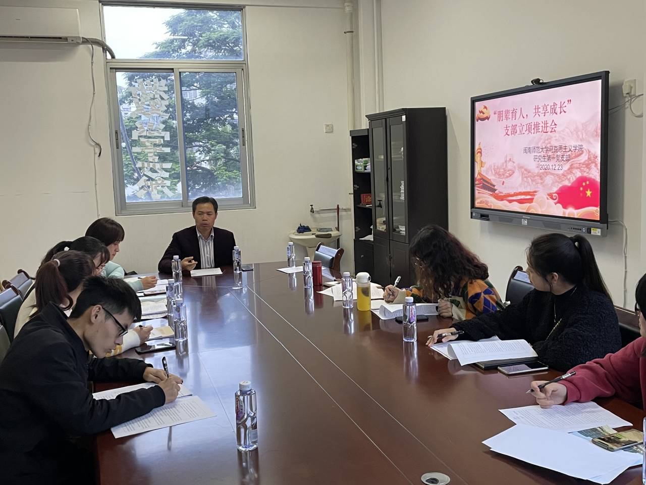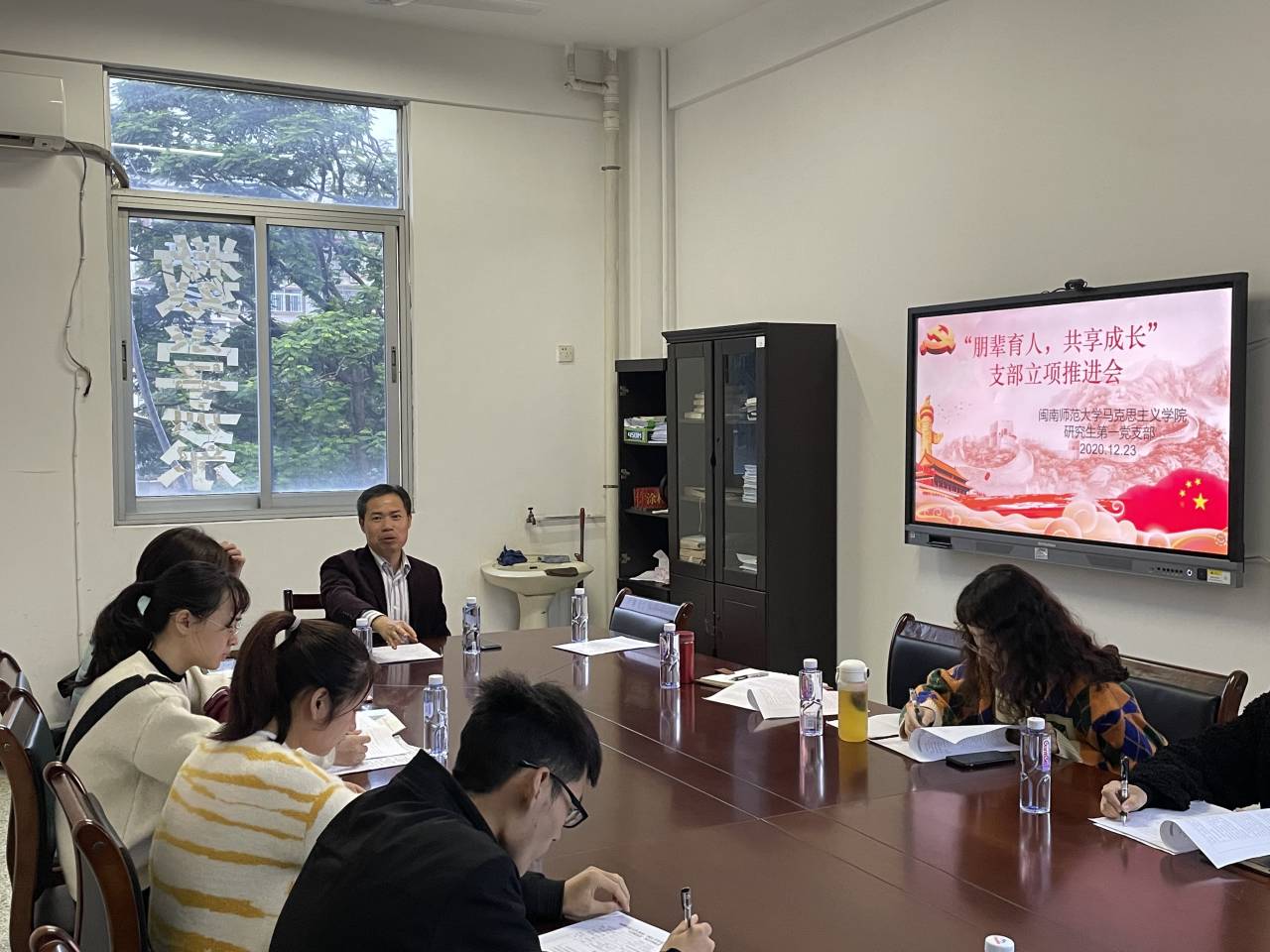2020年12月23日下午五点,永利23411集团于综东301召开了“朋辈育人,共享成长”支部立项推进会,研究生第一党支部挂钩领导校宣传部部长徐志怀、学院党委副书记陈佳薇、学院团委书记梁楹、研究生辅导员凌枫和研究生第一党支部委员会成员参加了会议。会上徐志怀部长首先就“朋辈育人,共享成长”项目的逻辑性、可行性和前景发表了自己的看法,对如何推动立项后的具体工作提出了一些指导意见,强调要对项目进行高度、深度和广度的全方位提升,在贯穿支部立项的主线中拓展内容,达到“形散神不散”的效果。其次要吸取坦洋工夫茶的成功经验,挖掘项目特色和优势,强调要将“朋辈育人,共享成长”项目品牌化,按照院级、校级、省级、国家级的层次提升项目的影响力,使其可复制从而实现推广。鼓励挖掘“朋辈”在新时代下的新内涵,思考如何建立不同层次朋辈间的交流实现成果共享。会后,参会人员均表示徐部长的指导让支部的立项工作有了更明确的方向,对于如何推进项目进行有了更宽阔的思路和更大的格局。