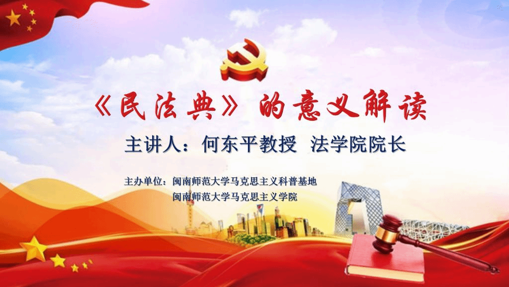 为深入学习贯彻落实党的十九届四中、五中全会精神和中央全面依法治国工作会议精神,进一步增强师生的法治观念,以法治宣传周为契机,开展普法宣传,12月10日晚,我院及校马克思主义科普基地联合主办的《中华人民共和国民法典》普法专题讲座在励志130举行。法学院院长何东平教授应邀做了题为《“民之基,国之远”--<民法典>的意义解读 》的精彩讲座。永利23411集团师生及校马克思主义理论读书社学生近200人现场聆听。讲座由我院院长助理何孟飞教授主持。