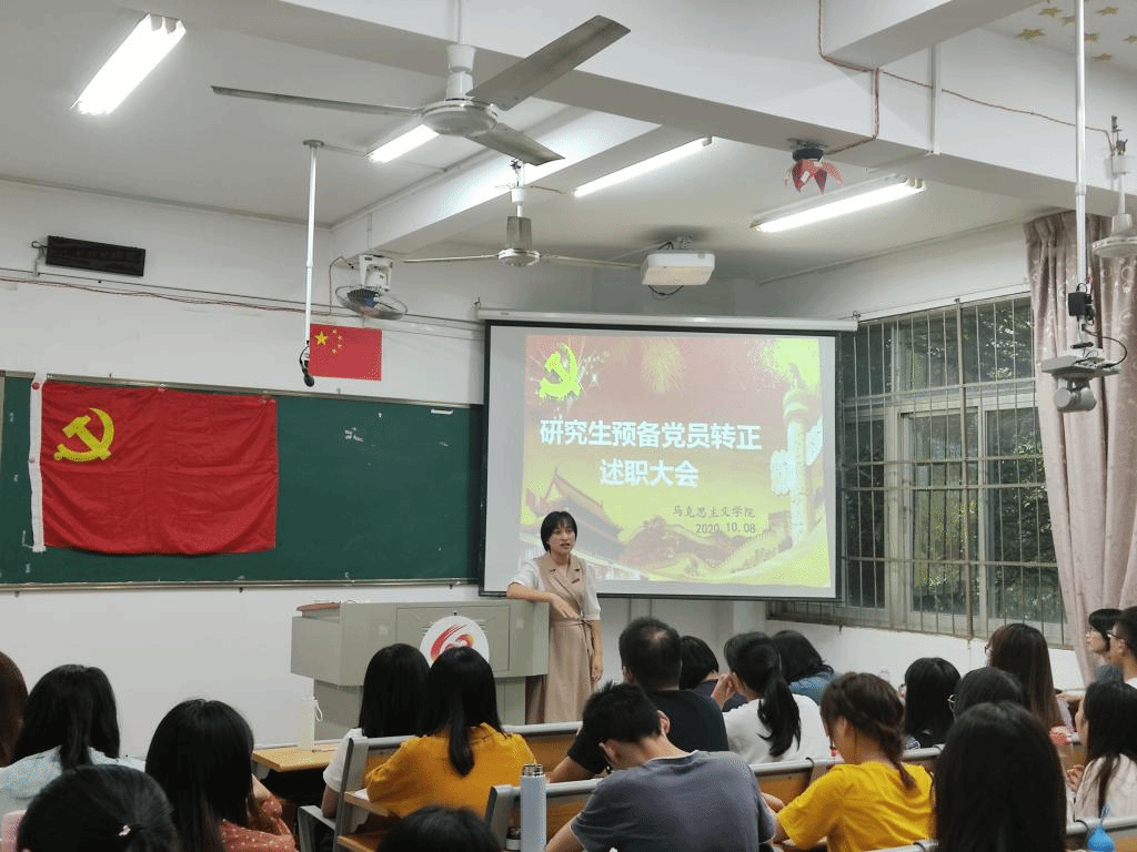 2020年10月8日下午我院在综南201召开研究生预备党员的转正述职大会,党委副书记陈佳薇老师、党委组织员黄艳红老师、研究生第一党支部书记张妍老师、全体研究生党员、发展对象、入党积极分子参加了此次会议。