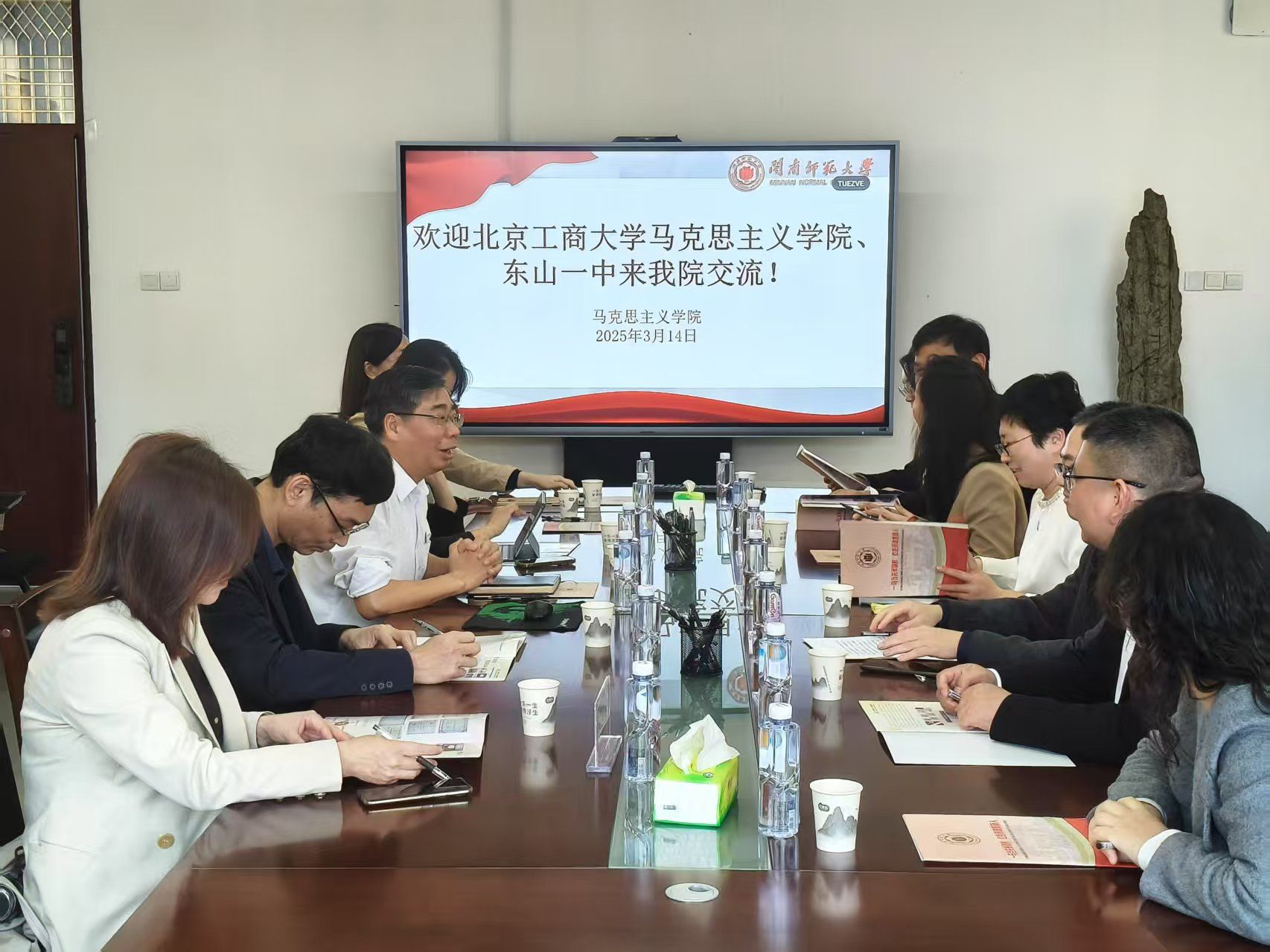 3月14日下午,北京工商大学永利23411集团、东山一中一行来我院交流。我院党委书记方琼、院长陈再生、副院长林海燕、毛泽东思想和中国特色社会主义理论体系概论教研室主任林志芳在综合楼404与来宾进行交流。
