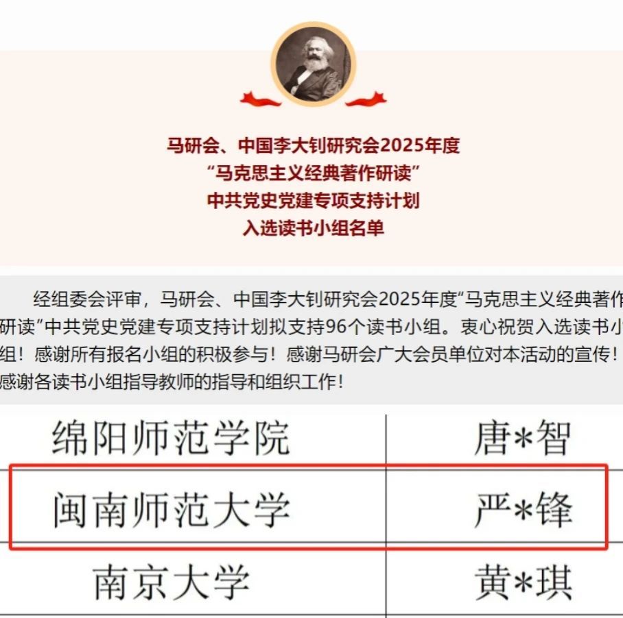 近日,由我院严城锋同学担任组长、余思新教授和江晓晖副教授共同指导的 “凌云先锋” 读书小组,成功入选中国高等教育学会马克思主义研究分会、中国李大钊研究会 2025 年度 “马克思主义经典著作研读” 中共党史党建专项支持计划。(通讯员 严城锋)